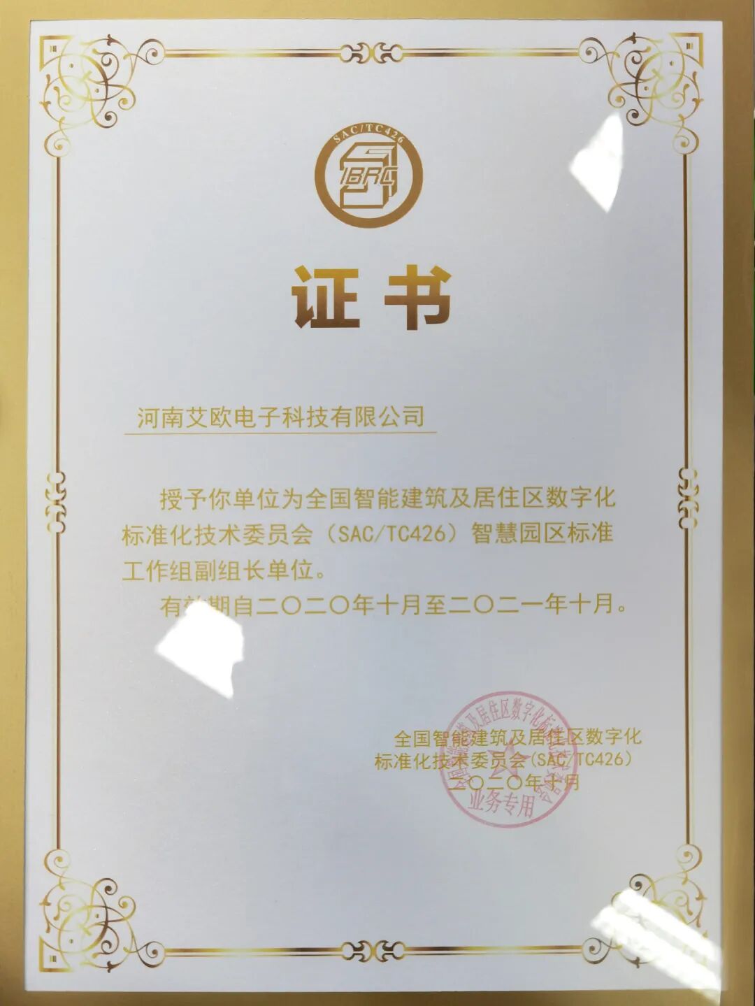 ·全国智标委智慧园区标准工作组副组长单位证书