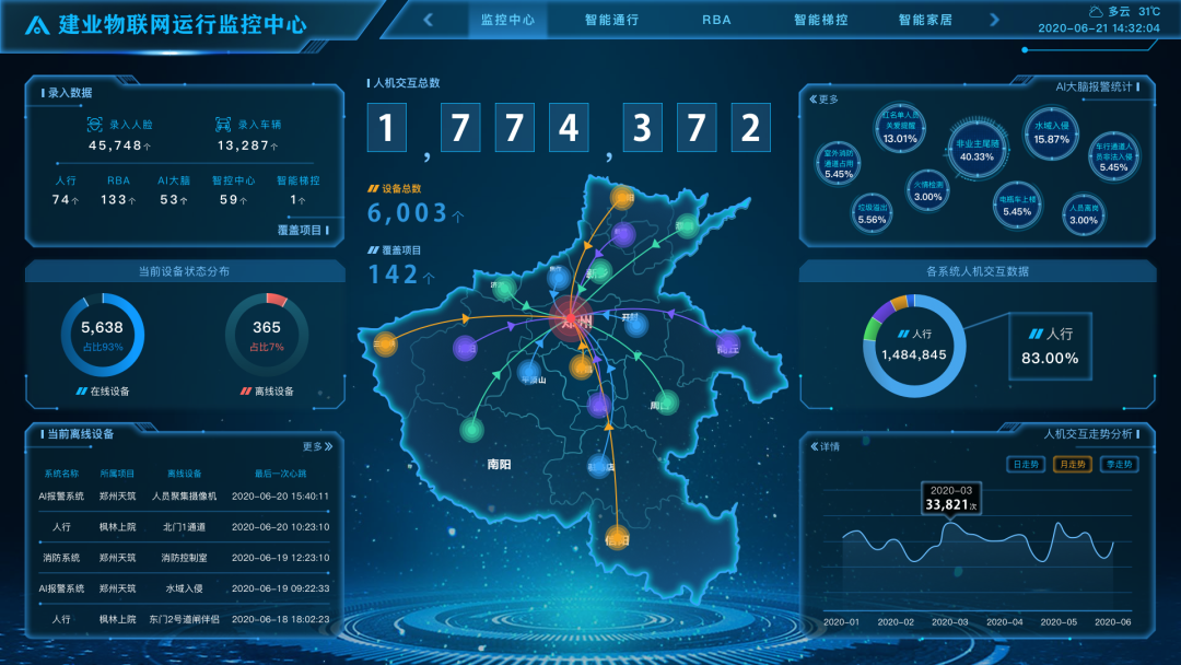 门禁、停车场、安防监控、可视对讲、物业设施设备管理,23年前的智能化需求,在23年后依然是提升生活品质的刚需配置。在建业5M智慧科技住宅中,依托于艾欧科技自助研发的建业5M智慧社区运维管理平台,这些刚需已经由社区AI大脑来满足,一套集数据采集、模拟运算、结果可视化、决策支持等于一体的智慧生态日渐完善。