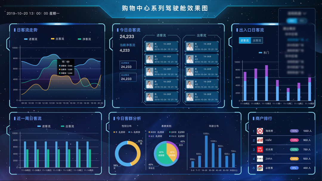 智慧云识客平台是一个针对购物中心、文旅、社区、楼宇、连锁门店等全业态、全场景营销需求建构的大数据技术服务平台,艾欧科技基于大数据处理及可视化开发,用人脸识别技术实现360°顾客面部实时特征点的识别、检测、跟踪以及跨场景、跨设备、跨时间的顾客连续行为关联,实现对客群的全方位感知和追踪管理。通过数据重构和多维度建模,实现客流监控、客流转化、辅助营销等多种可视化应用。